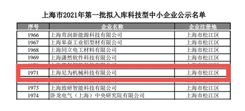 近日,根據(jù)《科技型中小企業(yè)評(píng)價(jià)辦法》,上海尼為機(jī)械科技有限公司被認(rèn)定為上海市2021年第1批擬入庫科技型中小企業(yè)。這是我司在科技創(chuàng)新型企業(yè)發(fā)展道路上取得的喜人成果,是有關(guān)部門給予我司研發(fā)和創(chuàng)新能力的認(rèn)可。